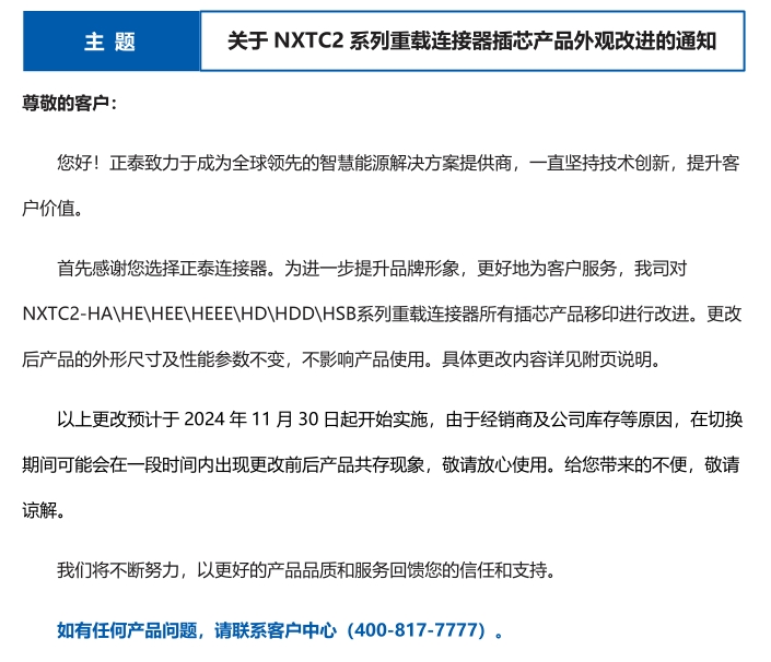 關(guān)于 NXTC2 系列重載連接器插芯產(chǎn)品外觀改進(jìn)的通知