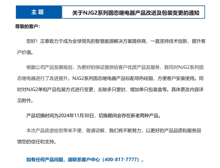 關(guān)于NJG2系列固態(tài)繼電器產(chǎn)品改進(jìn)及包裝變更的通知