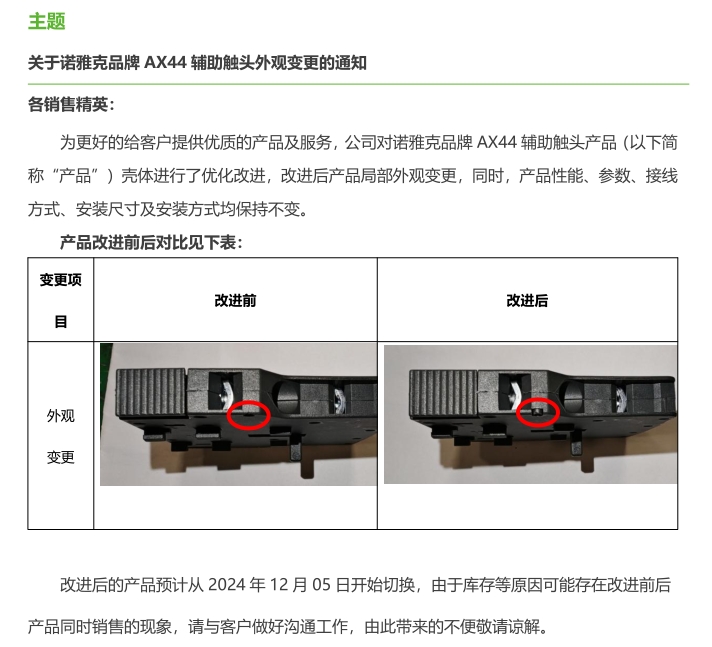 關(guān)于諾雅克品牌 AX44 輔助觸頭外觀變更的通知