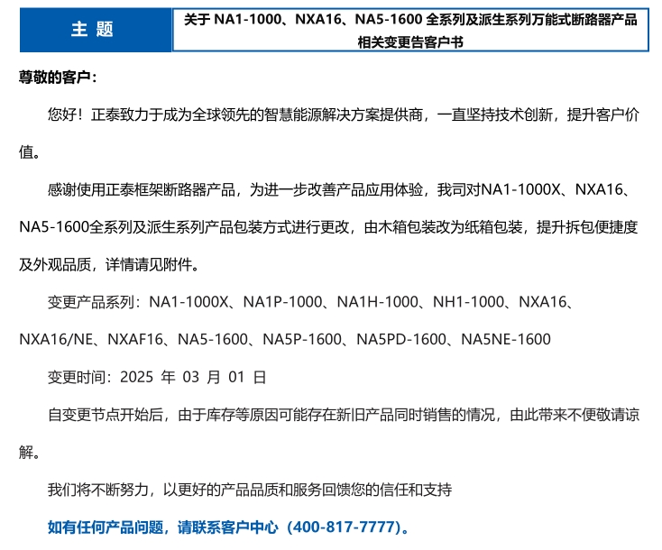關(guān)于 NA1-1000、NXA16、NA5-1600 全系列及派生系列萬能式斷路器產(chǎn)品 相關(guān)變更告客戶書