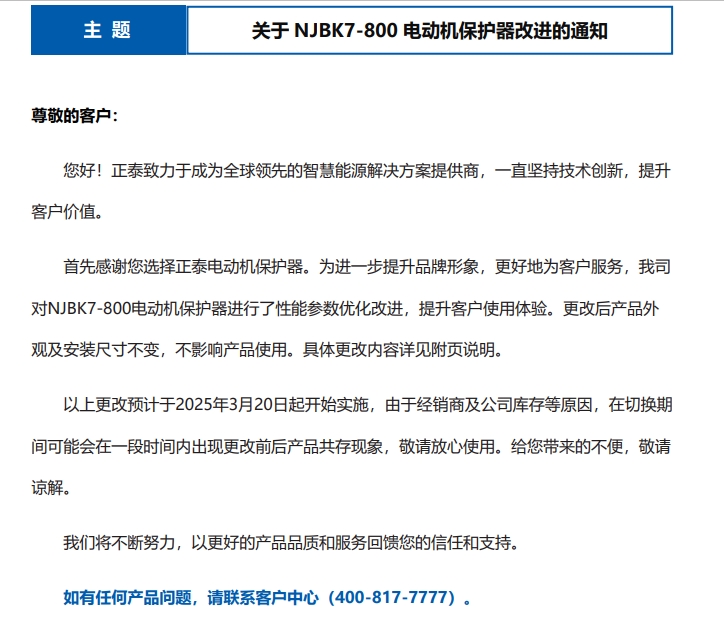 關于 NJBK7-800 電動機保護器改進的通知