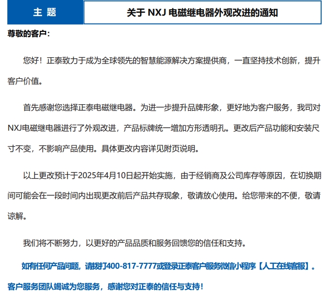 關于 NXJ 電磁繼電器外觀改進的通知