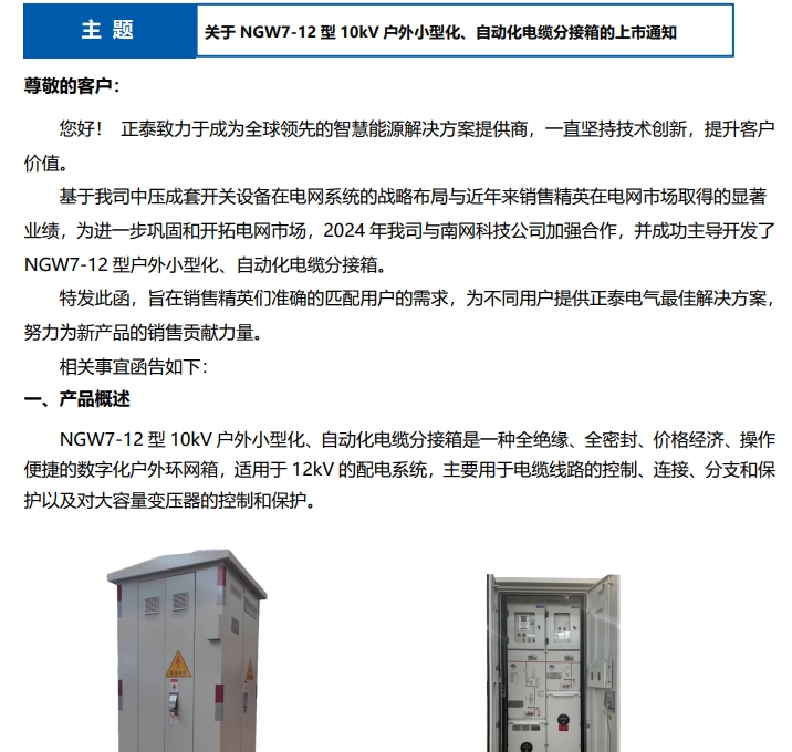 關(guān)于 NGW7-12 型 10kV 戶外小型化、自動化電纜分接箱的上市通知