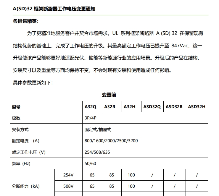 A(SD)32 框架斷路器工作電壓變更通知