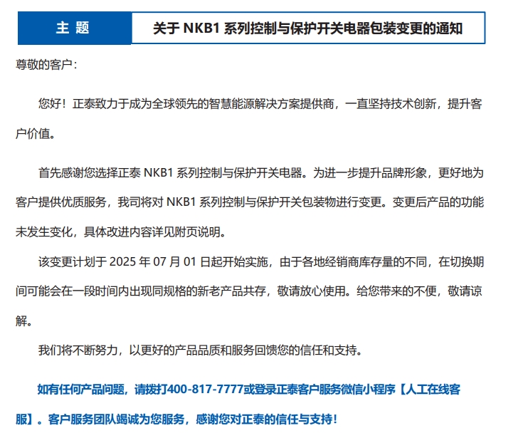 關(guān)于 NKB1 系列控制與保護(hù)開(kāi)關(guān)電器包裝變更的通知
