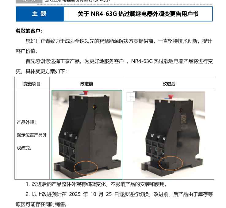 關(guān)于 NR4-63G 熱過載繼電器外觀變更告用戶書