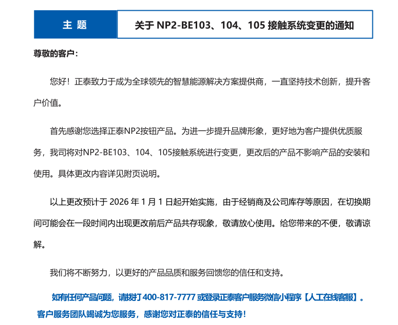 關于 NP2-BE103、104、105 接觸系統(tǒng)變更的通知