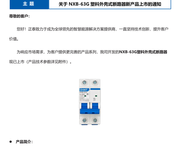 關(guān)于 NXB-63G 塑料外殼式斷路器新產(chǎn)品上市的通知
