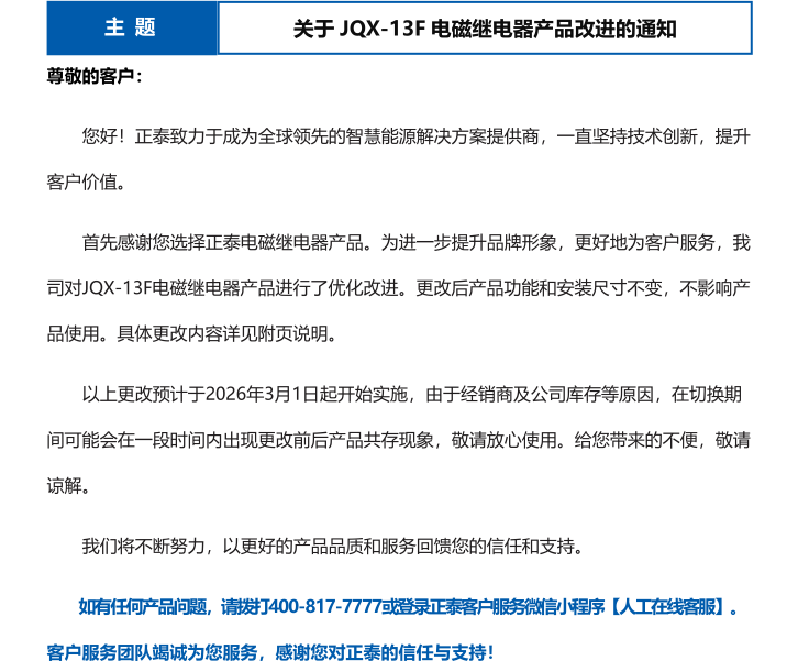關于 JQX-13F 電磁繼電器產品改進的通知