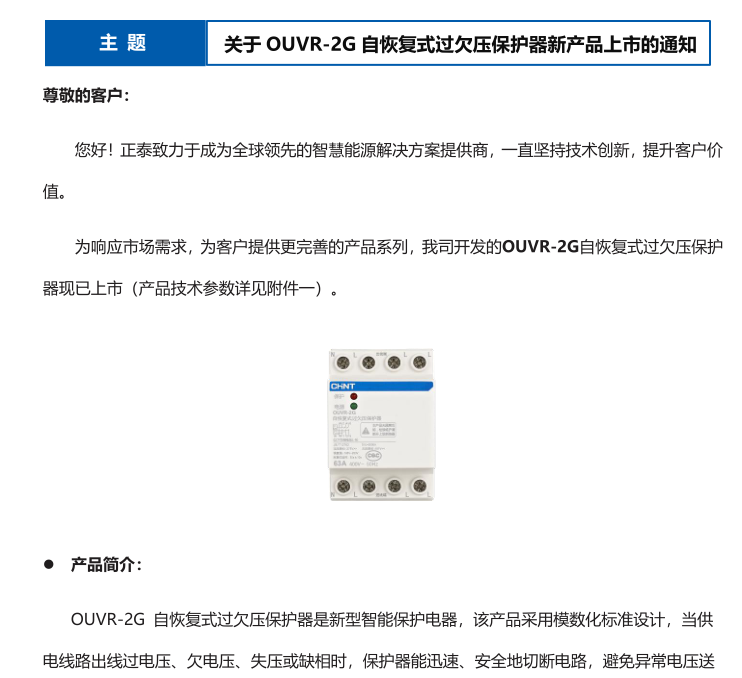 關(guān)于 OUVR-2G 自恢復(fù)式過欠壓保護器新產(chǎn)品上市的通知