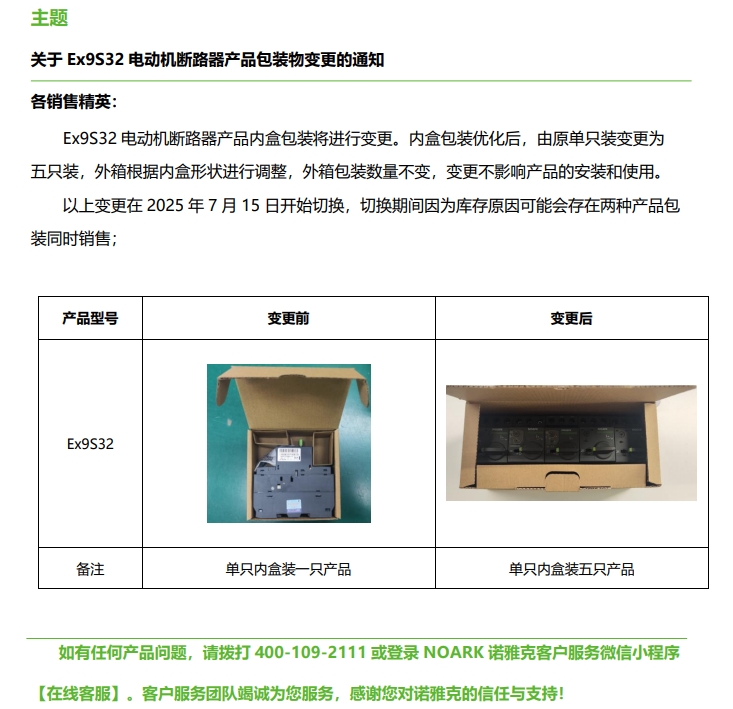 關(guān)于 Ex9S32 電動機斷路器產(chǎn)品包裝物變更的通知