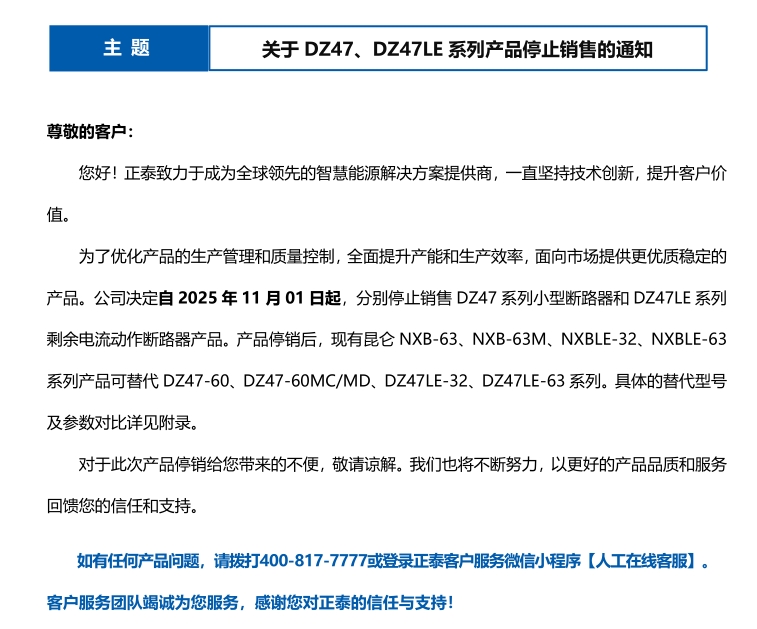 關(guān)于 DZ47、DZ47LE 系列產(chǎn)品停止銷(xiāo)售的通知