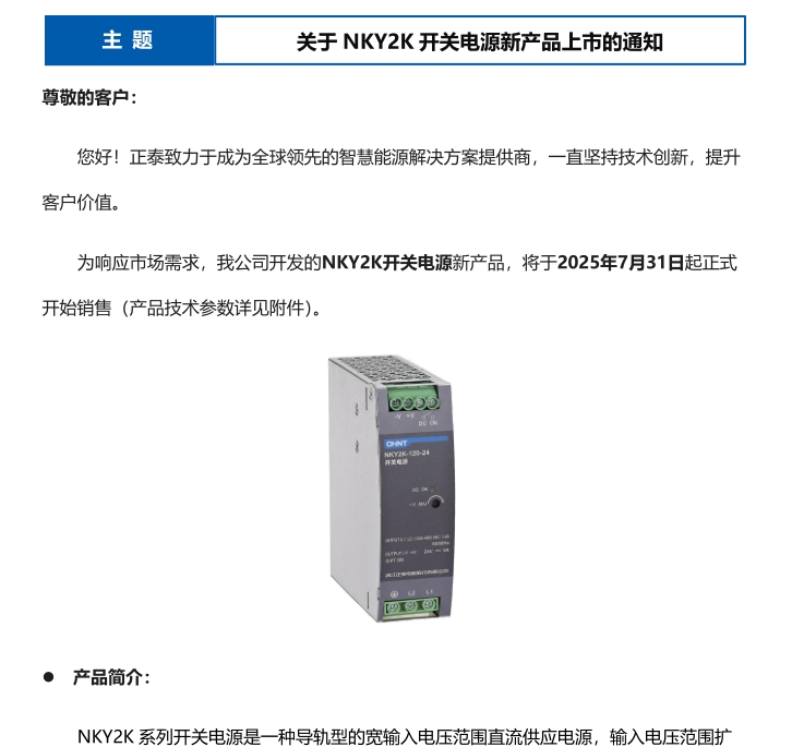 關于 NKY2K 開關電源新產(chǎn)品上市的通知