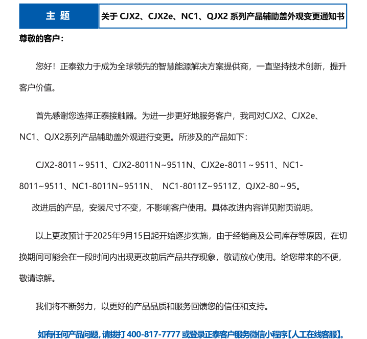 關(guān)于 CJX2、CJX2e、NC1、QJX2 系列產(chǎn)品輔助蓋外觀變更通知書(shū)
