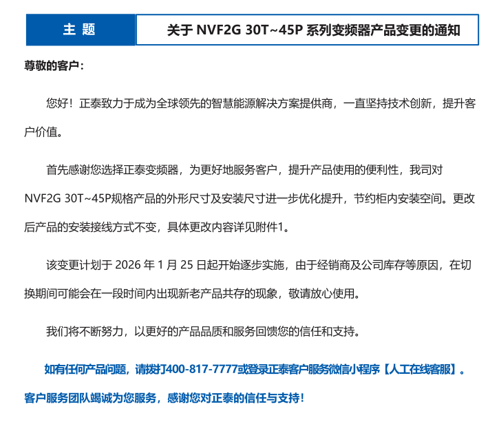 關(guān)于 NVF2G 30T~45P 系列變頻器產(chǎn)品變更的通知