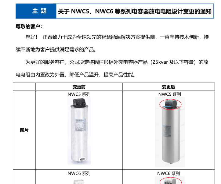 關(guān)于 NWC5、NWC6 等系列電容器放電電阻設(shè)計變更的通知